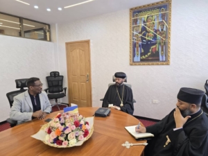 ብፁዕ አቡነ ሕርያቆስ ሊቀ ጳጳስ ከኢትዮጵያ ሃይማኖት ተቋማት ጉባኤ ጠቅላይ ጸሐፊ ሊቀ ትጉኃን ቀሲስ ታጋይ ታደለ ጋር በጽሕፈት ቤታቸው ውይይት አደረጉ